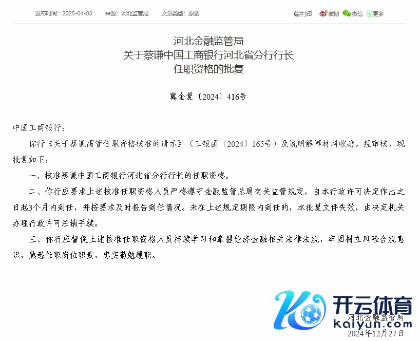 中国网财经1月6日讯近日万博manbext体育官网app官网万博manbext体育官网app官网,河北金融监管局公布批复知道,核准蔡谦中国工商银行河北省分行行长的任职资历。