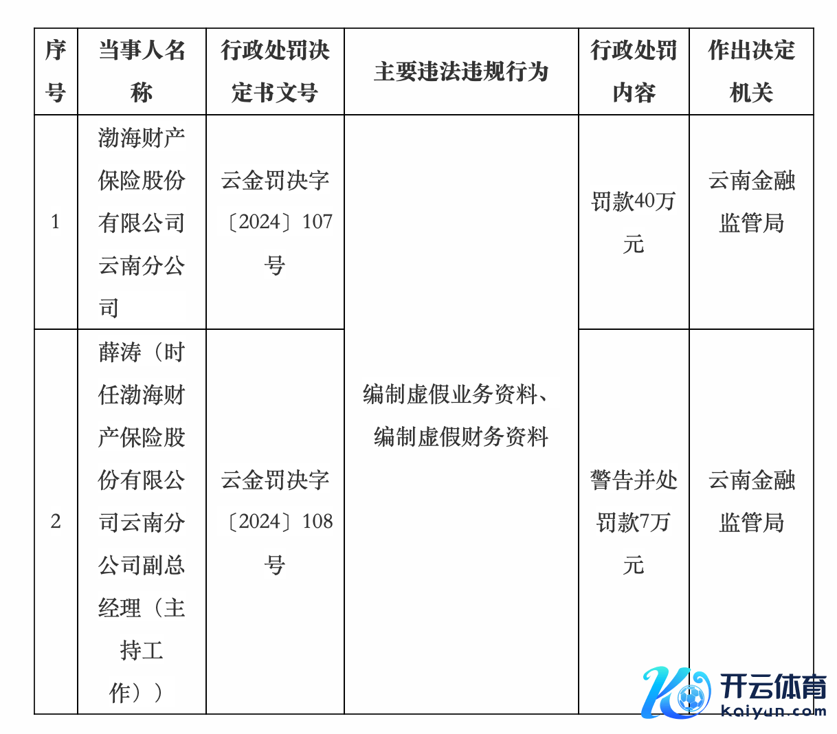 【大河财立方音信】1月6日音信万博manbext体育官网app娱乐,因编制不实业务贵寓、编制不实财务贵寓,国度金融监督经管总局云南金融监管局近日对渤海财产保障股份有限公司云南分公司开出40万元罚单。时任副总司理薛涛(主握职责)被劝诫并处罚金7万元。