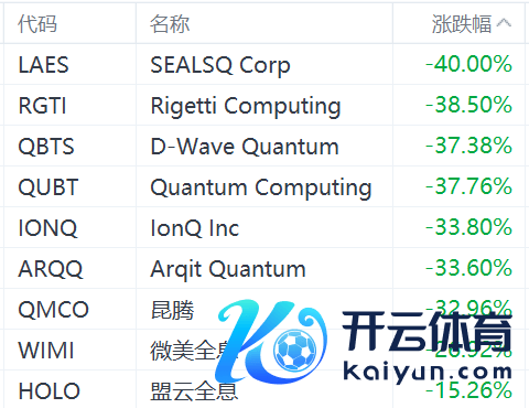格隆汇1月8日|好意思股市集量子筹谋办法股全线重挫。其中,SEALSQ Corp跌40%,Rigetti Computing、D-Wave Quantum、Quantum Computing、lonQ lnc、Arqit Quantum、昆腾跌超30%,微好意思全息跌26%,盟云全息跌超15%。音尘面上,英伟达CEO黄仁勋此前指出量子筹谋机收场专揽至少要等15年。