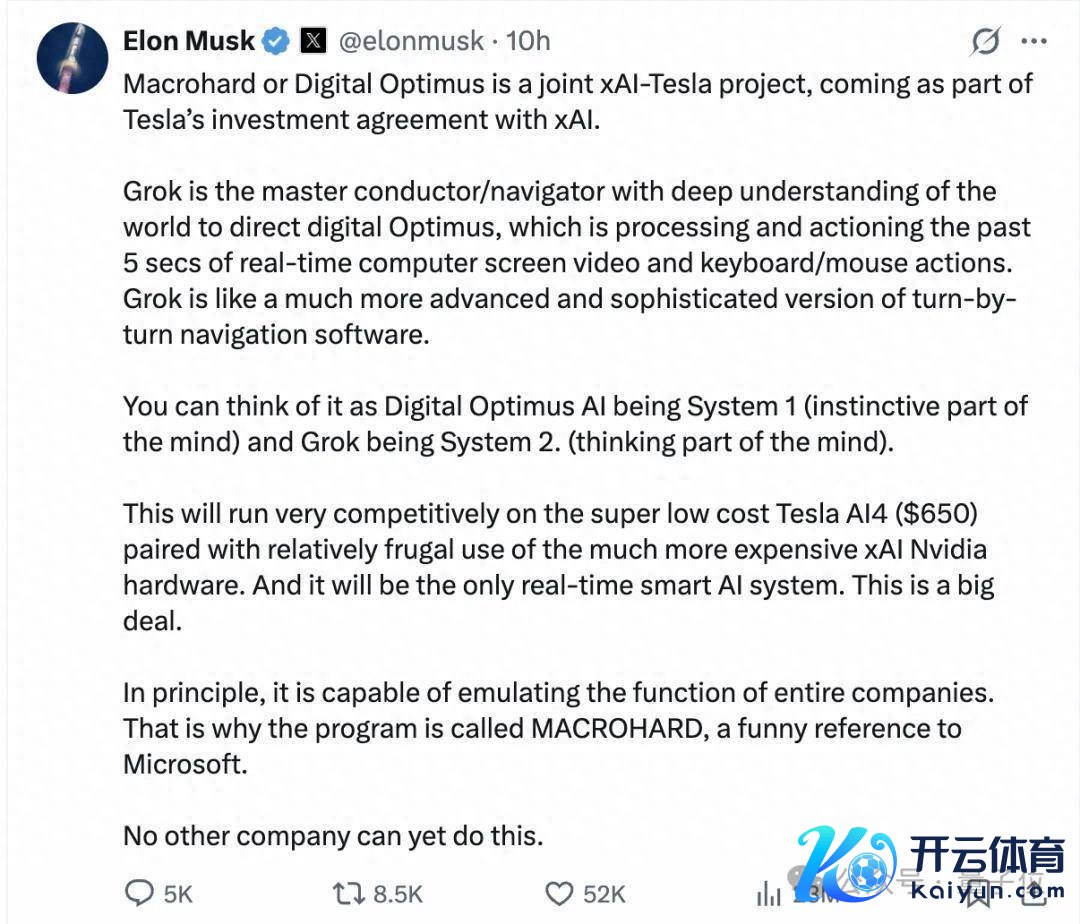 刚刚,马斯克在X上告示了一项“新”的AI模样:数字擎天柱(Digital Optimus)/巨硬(Macrohard)。
