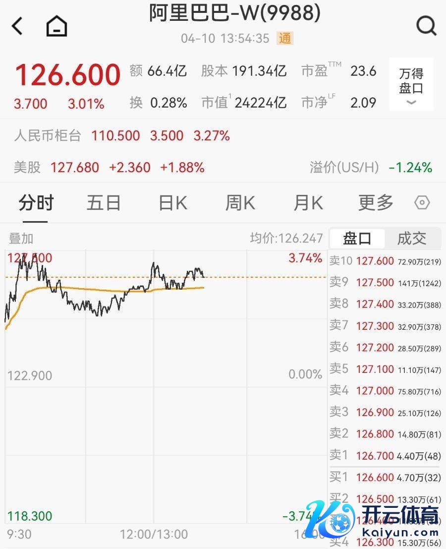 扬弃4月10日13:54,阿里巴巴股价涨超3%,报126.6港元/股,总市值为2.42万亿港元。