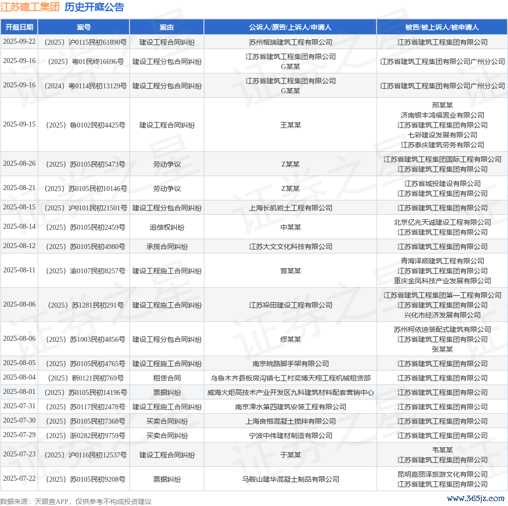 案号:(2025)苏0105民初4980号审理法院:南京市建邺区东说念主民法院案由:承揽条约纠纷当事东说念主信息: 原告/上诉东说念主:江苏大文文化科技有限公司 被告/被上诉东说念主:江苏省建筑工程集团有限公司开庭日历:2025年8月12日凭证统计,近一年内以江苏省建筑工程集团有限公司为当事东说念主的历史开庭公告有1126则,其中案由为“贸易条约纠纷”的公告以258则居首,其次为“竖立工程施工条约纠纷”有179则,“竖立工程分包条约纠纷”有133则。历史开庭公告(前20条)如下: