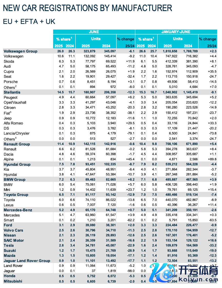 凭证欧洲汽车制造商协会(ACEA)发布的数据透露现金万博manbext体育官网app平台,2025年1-6月欧洲(欧盟27国+冰岛+挪威+瑞士+英国)新车注册比前年同时下降0.9%至6,815,320辆。